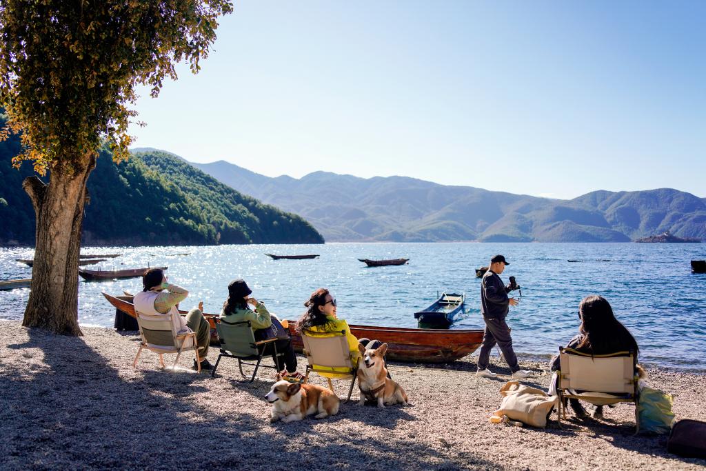 2月6日,游客与宠物在四川凉山泸沽湖景区游玩。