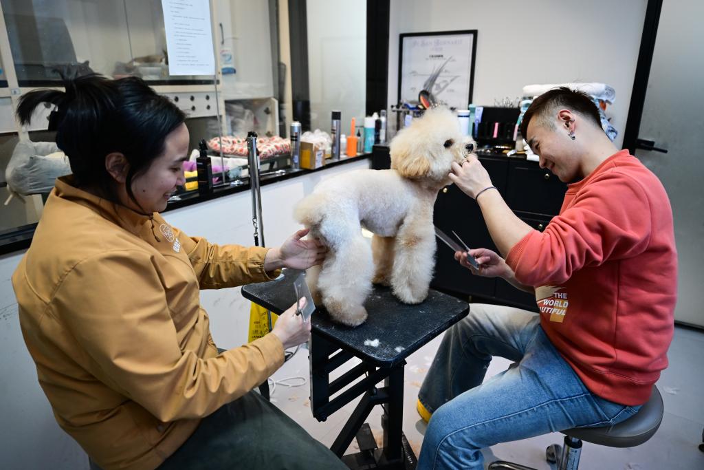 2月6日,在安徽省合肥市一家名叫“极爱宠物”的店内,工作人员给小狗做美容。