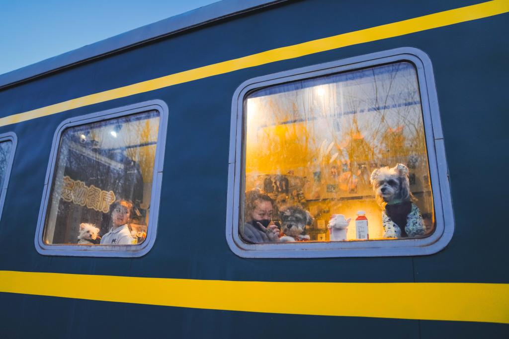 2月3日,在吉林省长春市一家火车车厢主题的宠物餐厅,几只宠物狗坐在窗边等待“宠物年夜饭”。