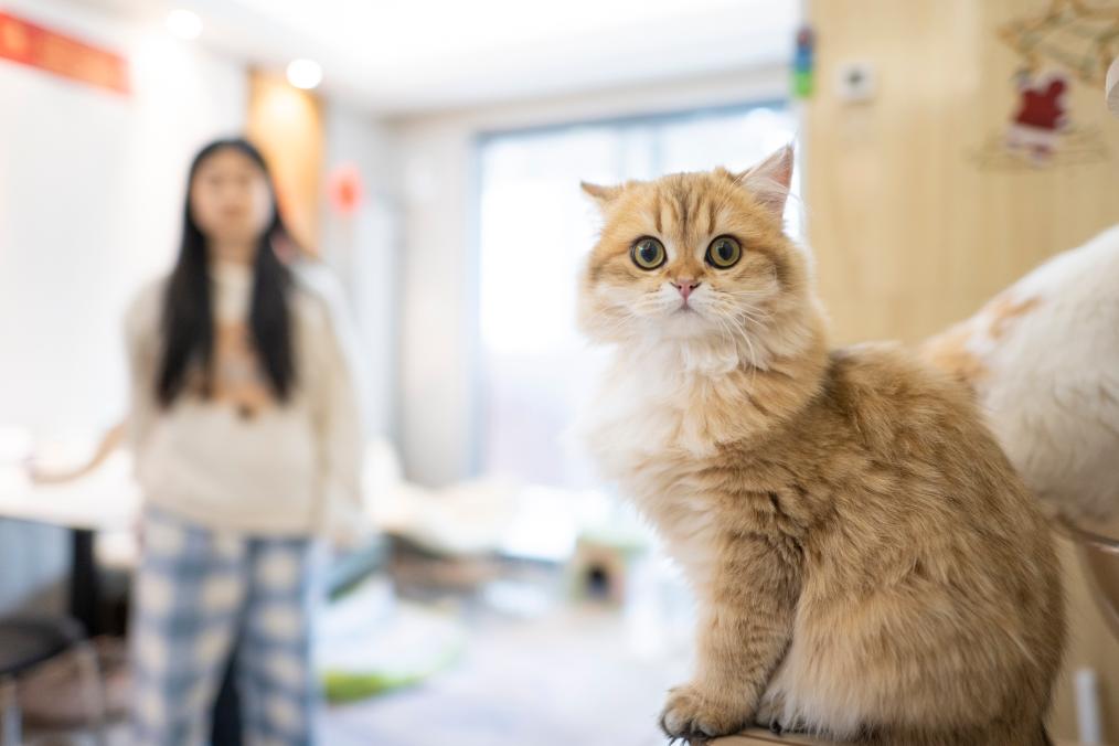 2月4日,在吉林省长春市一家宠物店内,饲养员李梦思从柜子中抱出一只将在店内寄养过春节的宠物猫。