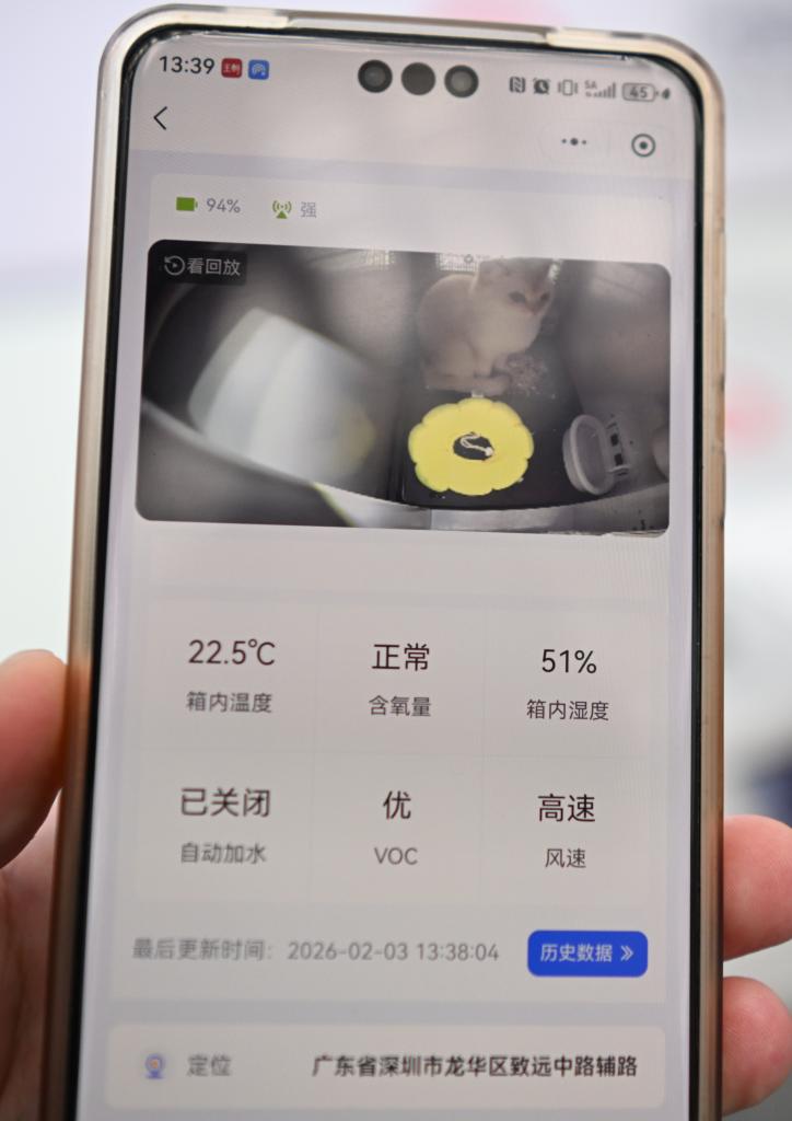 2月3日,在深圳北站中铁快运营业部,工作人员展示宠物托运专用箱内的视频画面。