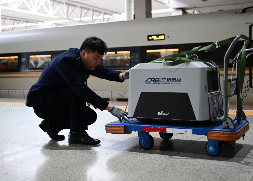 2月6日,在合肥南站站台,工作人员在“高铁宠物运输箱”装车前查看宠物状态。