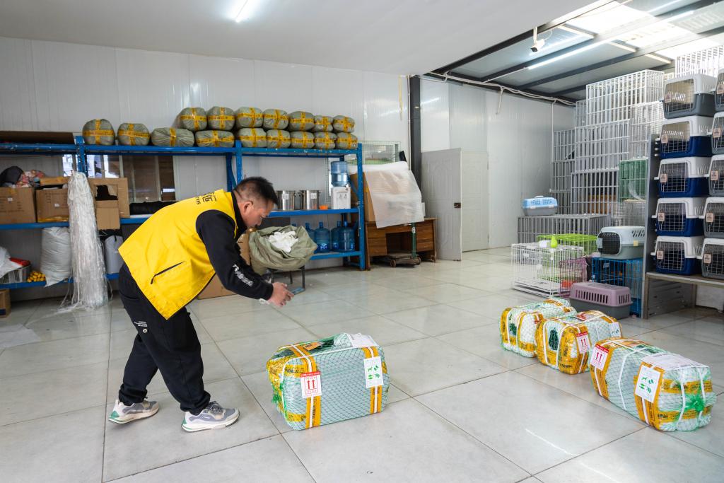 1月31日,在云南省昆明市,空运出发前,一家宠物托运公司的工作人员为打包好的托运宠物拍照记录,并同步给顾客。