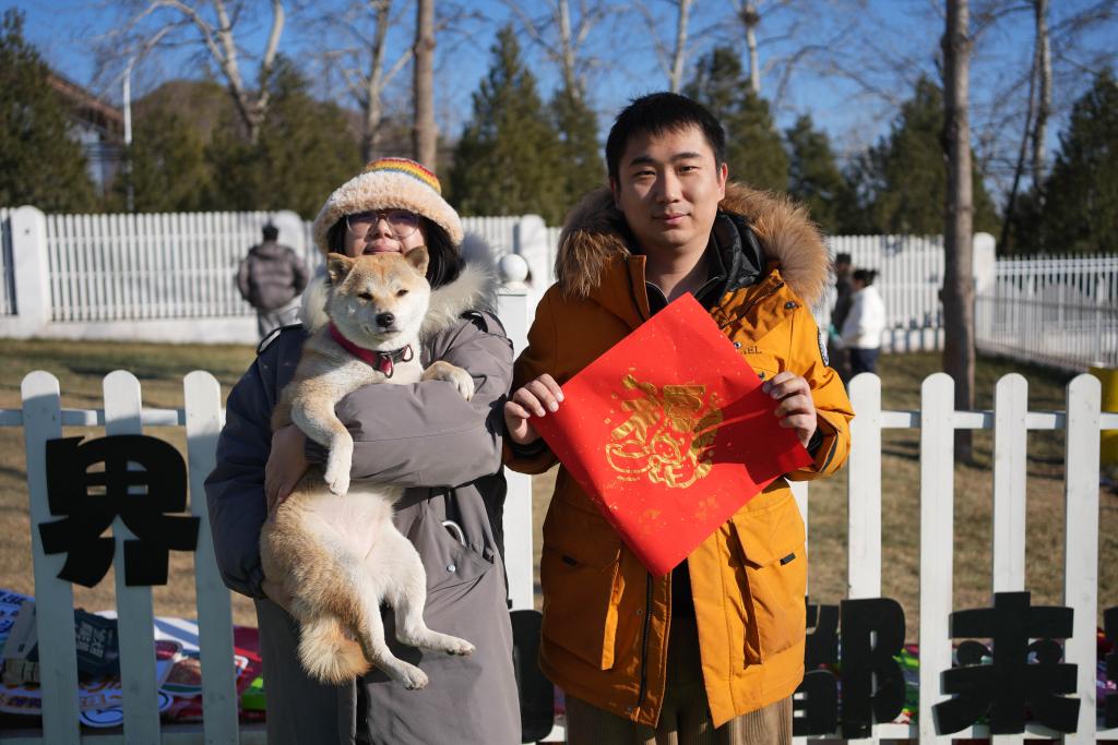 1月31日,在北京市昌平区“北京犬时代宠物公园”内的宠物庙会上,宠物主人与宠物合影。