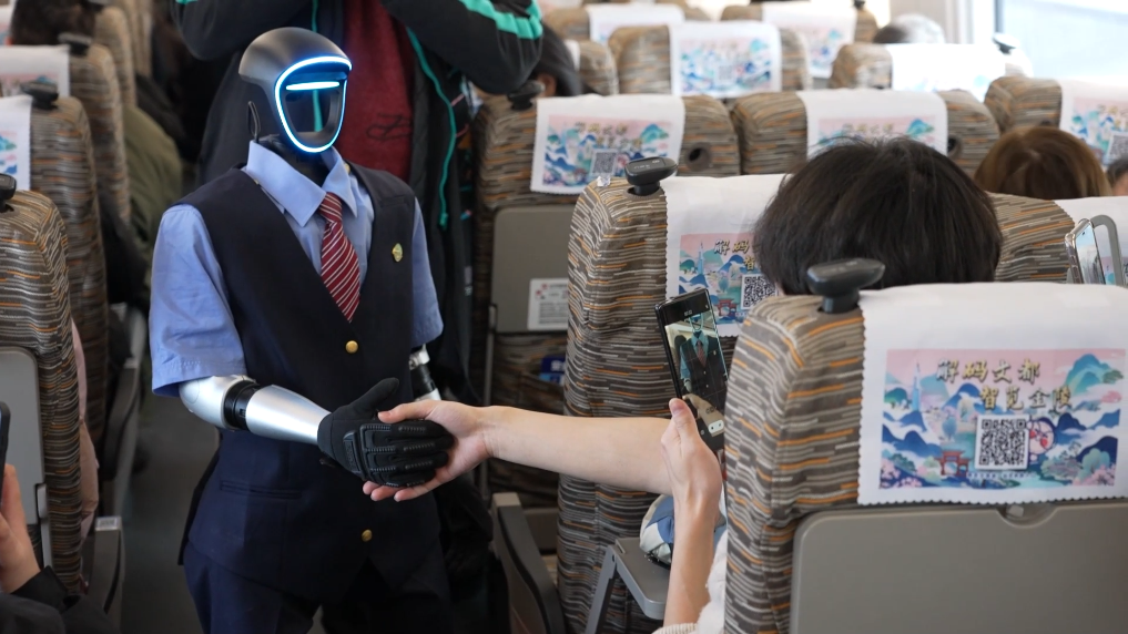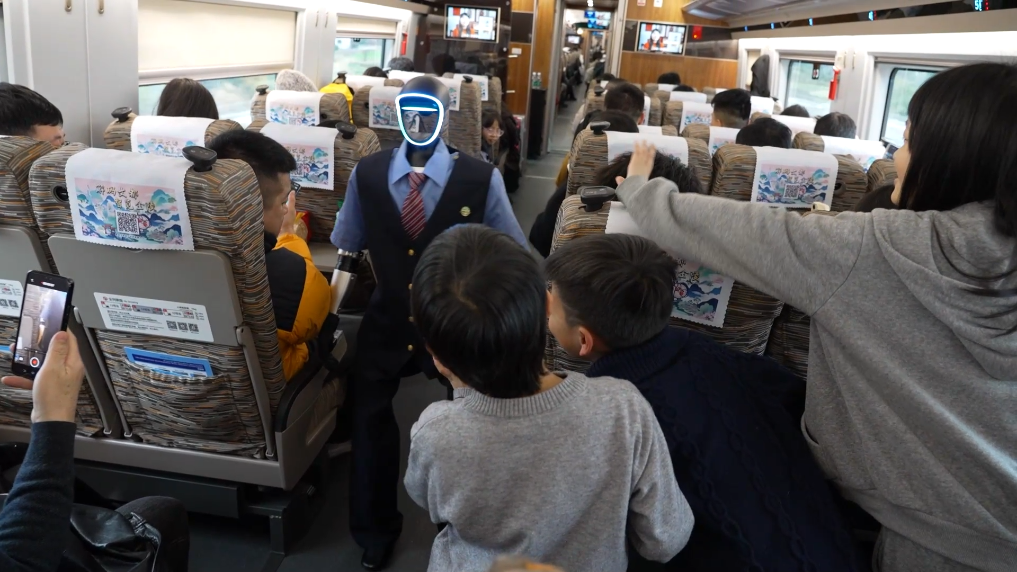 车厢内,身着铁路制服的“福兴”可以与旅客进行打招呼、握手等互动,还能提供出行信息咨询服务,让不少旅客感到惊喜与好奇。