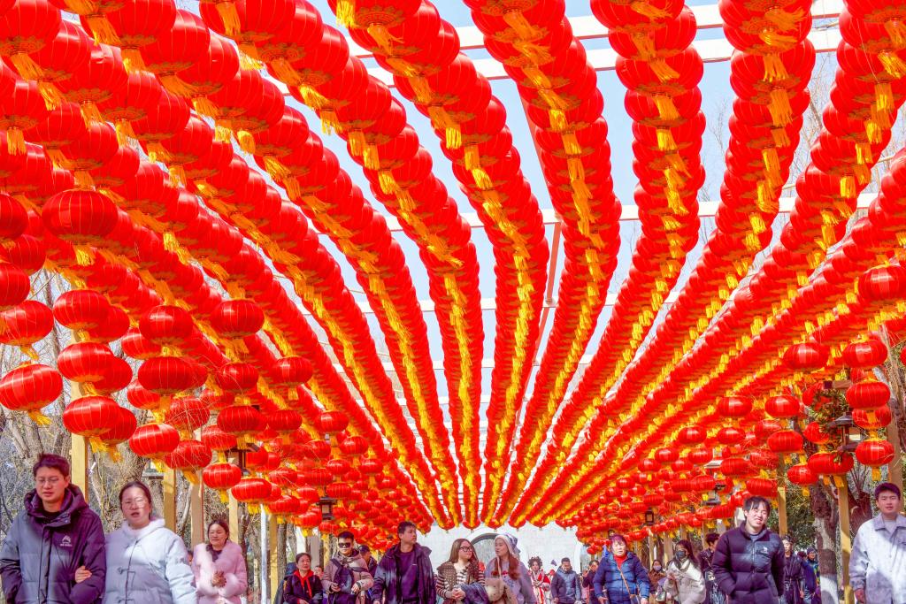 2月10日农历腊月二十三,人们在河南省洛阳市龙门石窟景区的红灯笼景观下参观游览。新华社发(张怡熙 摄)