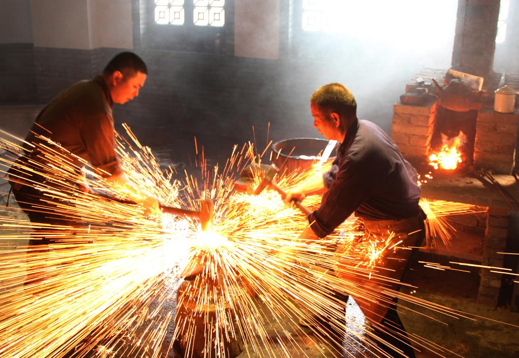 国家级非遗代表性传承人、沈广隆剑铺第四代传人沈新培(右)与第五代传人沈州锻造宝剑。(受访者供图)
