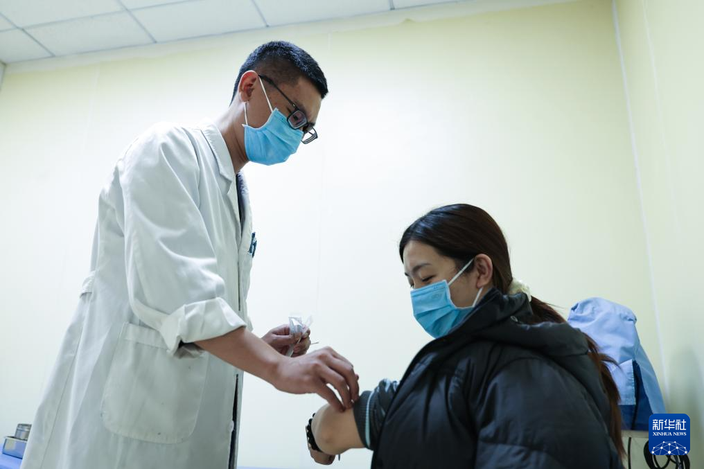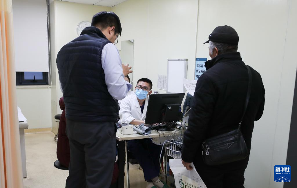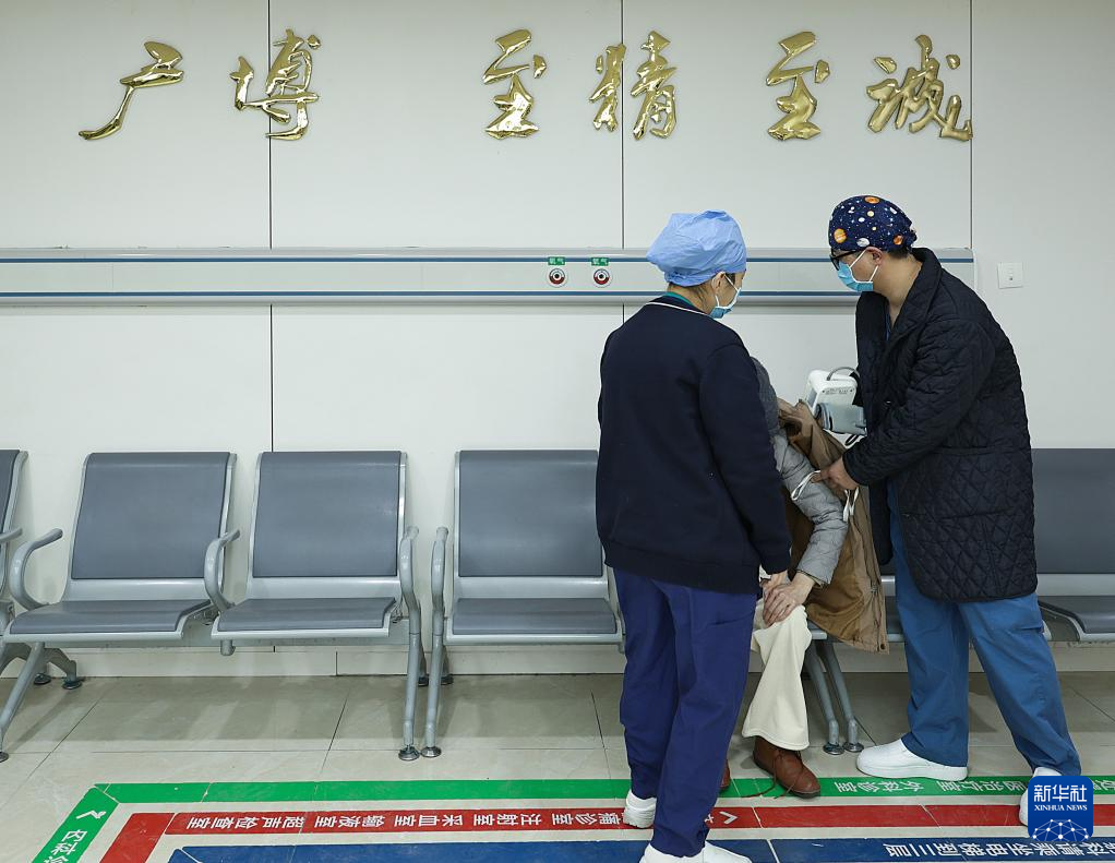 2月5日21时许,两名值班护士在急诊大厅为一名患者测血压。