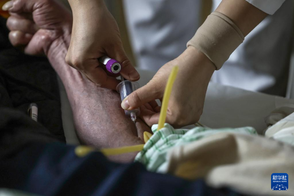 2月4日5时许,一名护士在急诊病房为患者抽血。
