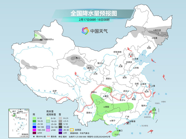 明天,新疆南疆盆地、西藏西部和东南部、青海西部、川西高原北部等地部分地区有小到中雪或雨夹雪。江南西部、西南地区东部、华南北部和西部、台湾岛等地部分地区有小到中雨。