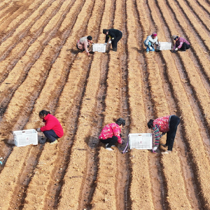 2月13日,在山东省枣庄市山亭区桑村镇,农民在播种马铃薯(无人机照片)。新华社发(李宗宪摄)