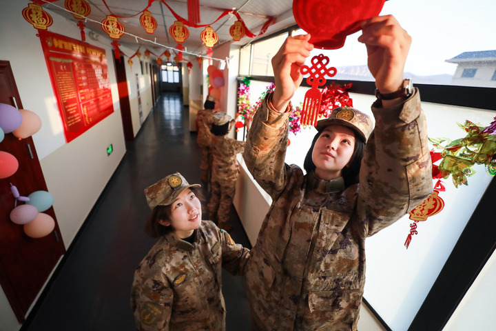 2月14日,火箭军某部官兵在营区内贴福字、挂灯笼,布置春节氛围。(何仕儒 摄)
