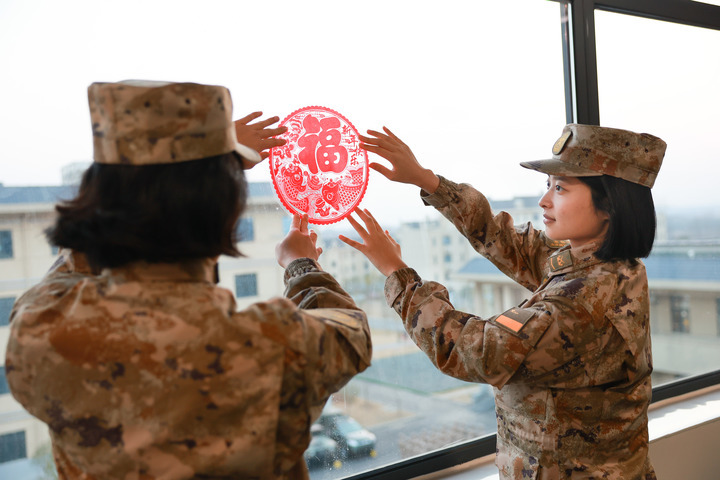2月14日,火箭军某部官兵在营区内贴福字,布置春节氛围。(何仕儒 摄)