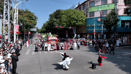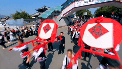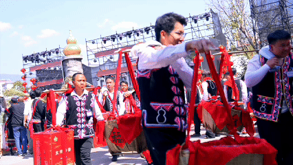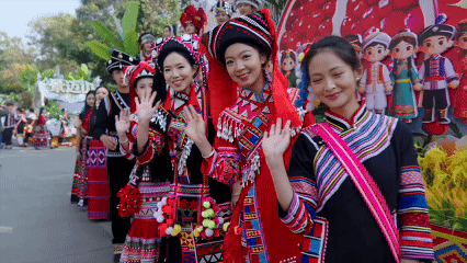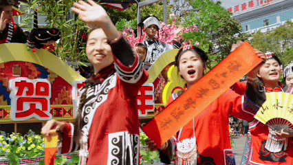 “扩塔”为拉祜语,意为“过年”。巡游队伍中,各族拜年团身着节日盛装,带着精心准备的年猪、茶叶、甘蔗、糯米粑粑等拜年礼品组成方阵。