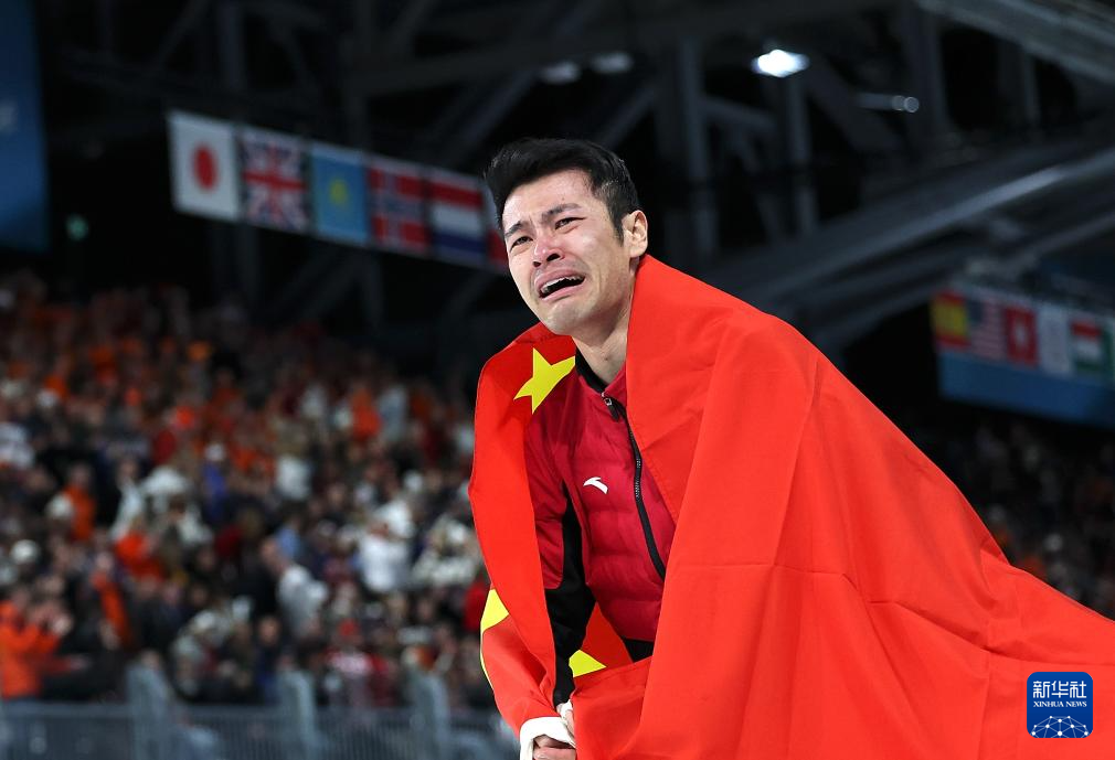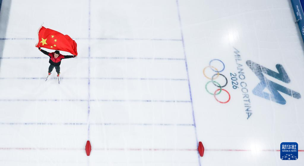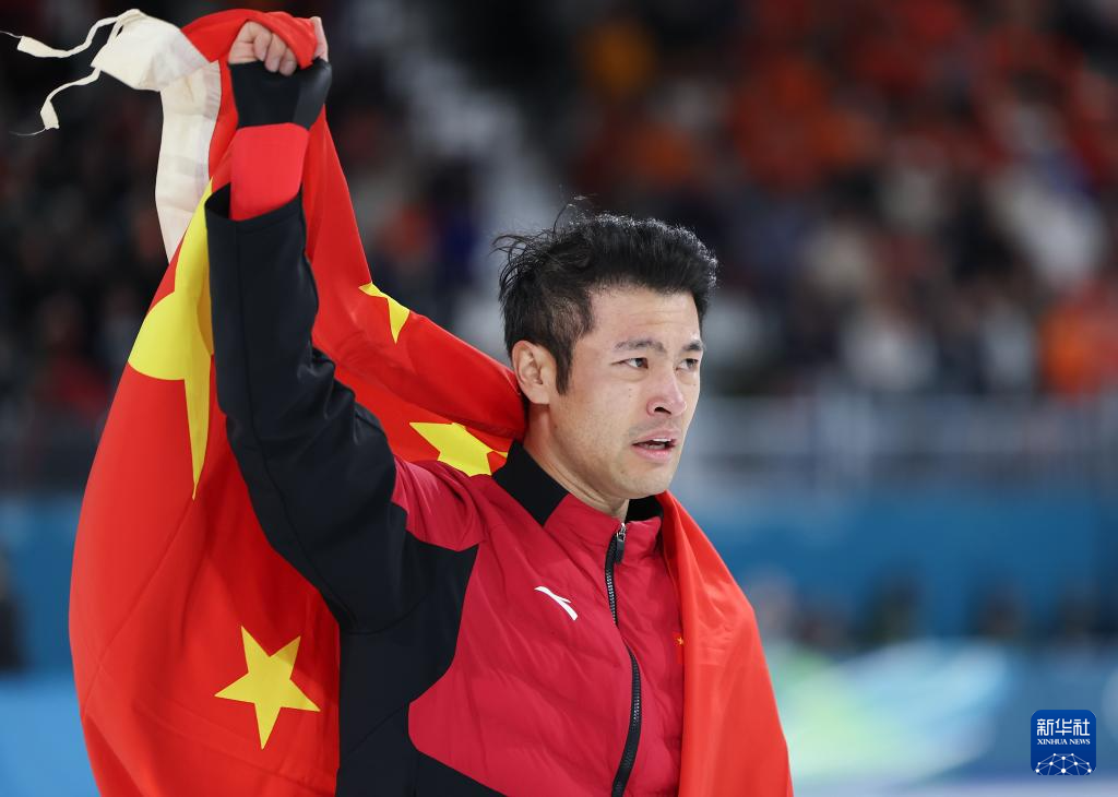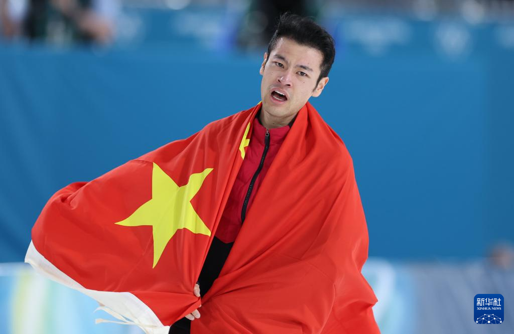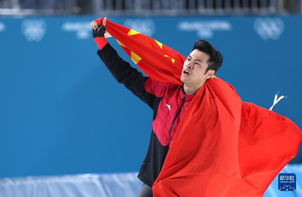 2月19日,宁忠岩在赛后身披国旗庆祝。