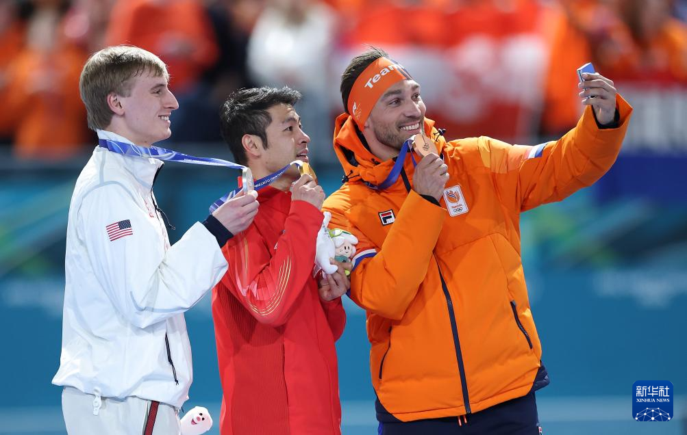 2月19日,冠军中国选手宁忠岩(中)、亚军美国选手乔丹·斯托尔兹(左)、季军荷兰选手凯尔·内斯在颁奖仪式上自拍合影。