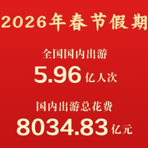文化和旅游部2月24日公布2026年春节假期文化和旅游市场情况。春节假日9天,全国国内出游5.96亿人次,较2025年春节假日8天增加0.95亿人次;国内出游总花费8034.83亿元,较2025年春节假日8天增加1264.81亿元。假日游客人数和花费均创历史新高。