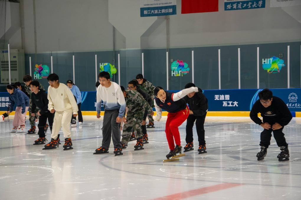 哈尔滨工业大学奥林匹克研究中心主任张虹(右三)在哈尔滨工业大学教学生滑冰。(受访者供图)