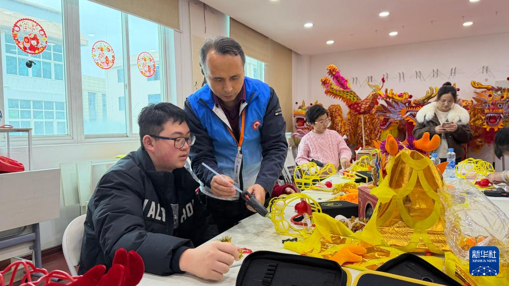 2月24日,在江西南昌城南龙灯非遗工坊,传承人史克滨(左二)教学生制作彩带龙。新华社发