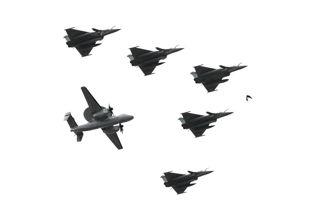 2024年7月14日,在法国巴黎凯旋门附近,法国空军飞机参加国庆节阅兵式的飞行表演。新华社记者高静摄