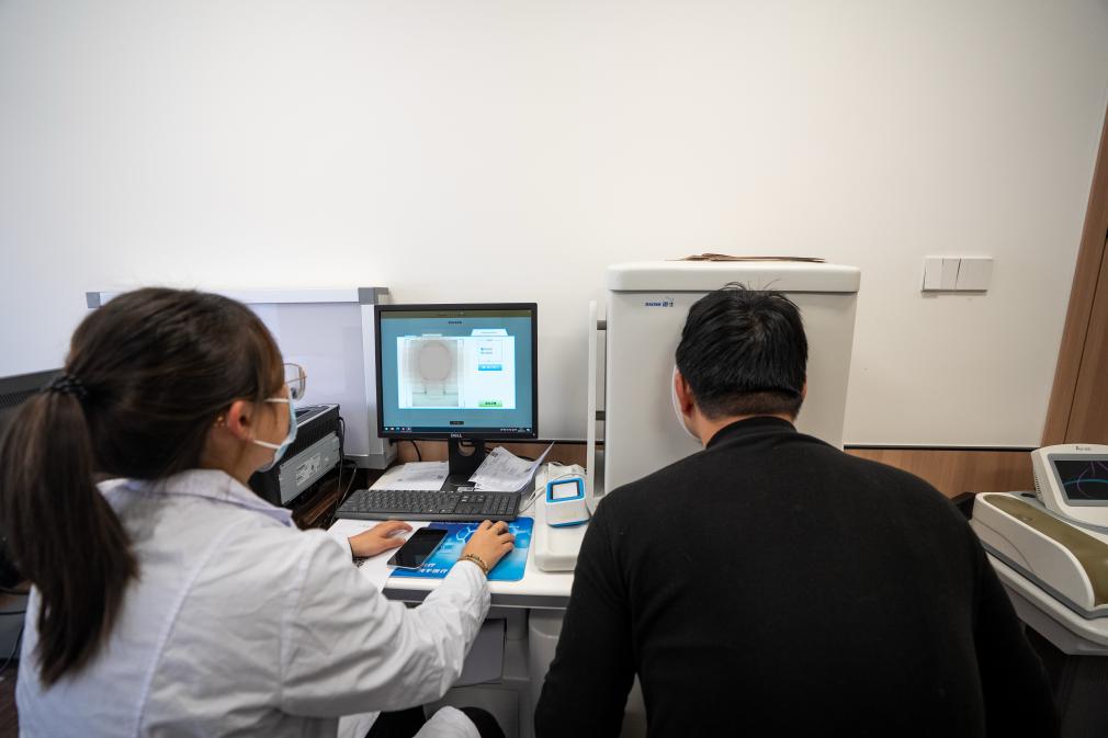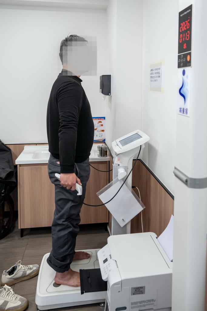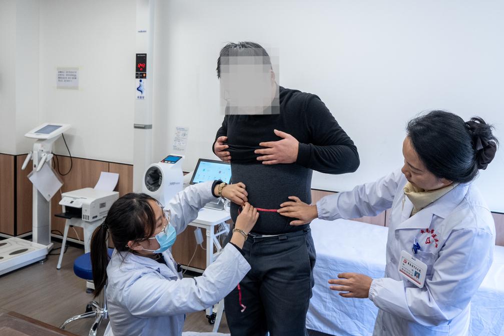 云南省中医药体重管理中心副主任柴媛(右)在给一名求医者测量腰围