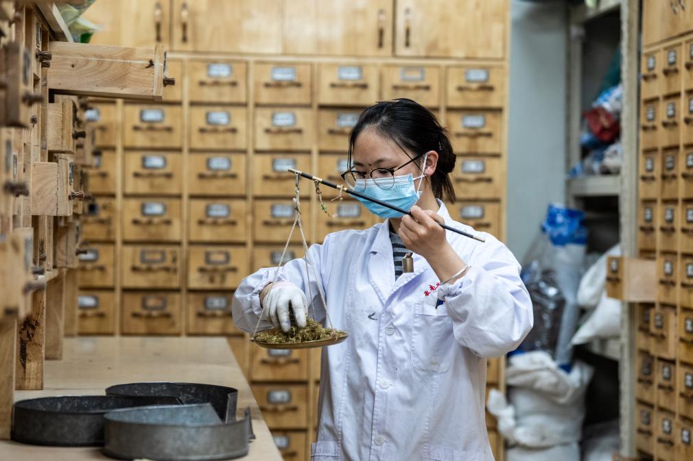 云南省中医医院的工作人员在配药↑