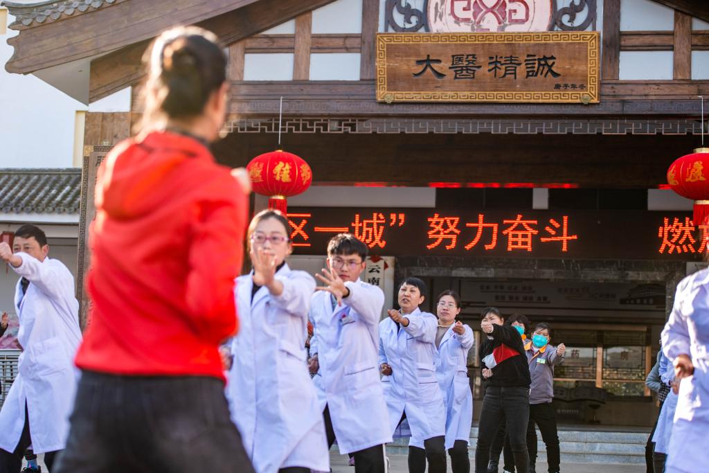 云南省昆明市寻甸回族彝族自治县中医院医生和患者在做八段锦↑