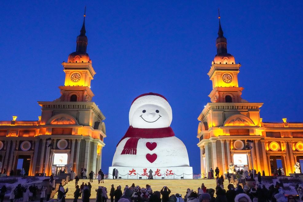 2026年1月10日,游客在哈尔滨市群力音乐公园的大雪人前打卡拍照。新华社记者 王建威 摄