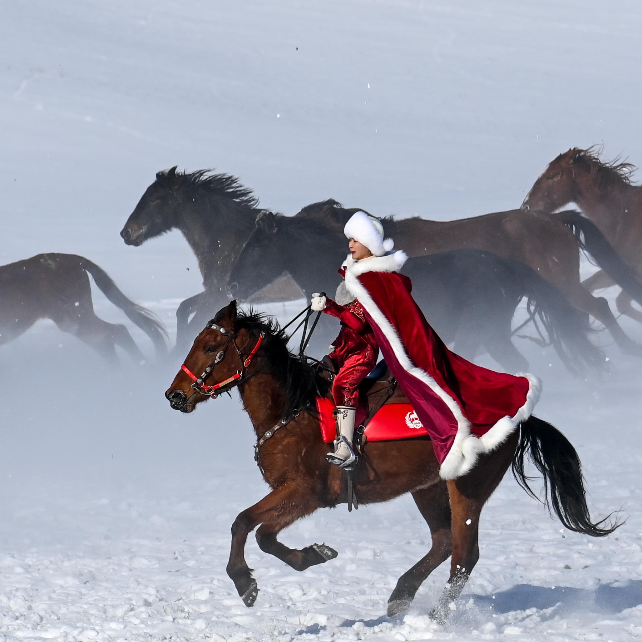 2020年12月31日,贺娇龙在昭苏县天马旅游文化园策马雪原,为家乡宣传。新华社记者 白志强 摄