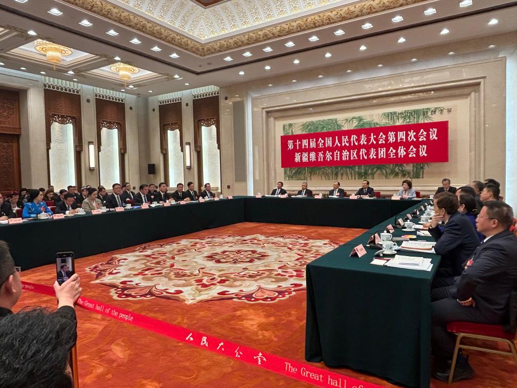十四届全国人大四次会议新疆维吾尔自治区代表团全体会议现场。新华社记者 刘雅萱 摄