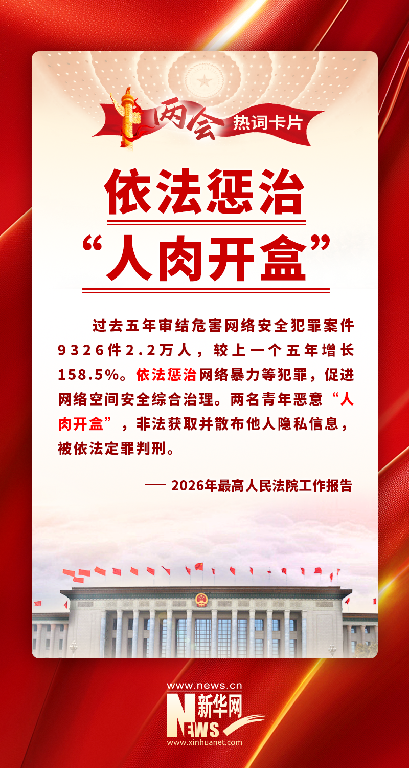 最高人民法院办公厅副主任海伟:当前新型犯罪案件数量增长较快,比如,过去五年法院审结的危害网络安全犯罪案件,较上一个五年增长158.5%。继2024年、2025年报告强调惩治“按键伤人”“按键杀人”行为后,今年报告又特别提到惩治“人肉开盒”这种新型网络暴力犯罪,就是警示网络空间决不是法外之地。