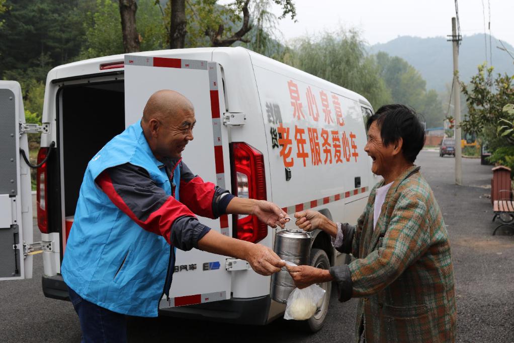 志愿者给北京市延庆区珍珠泉乡的农村老人送餐。新华社发