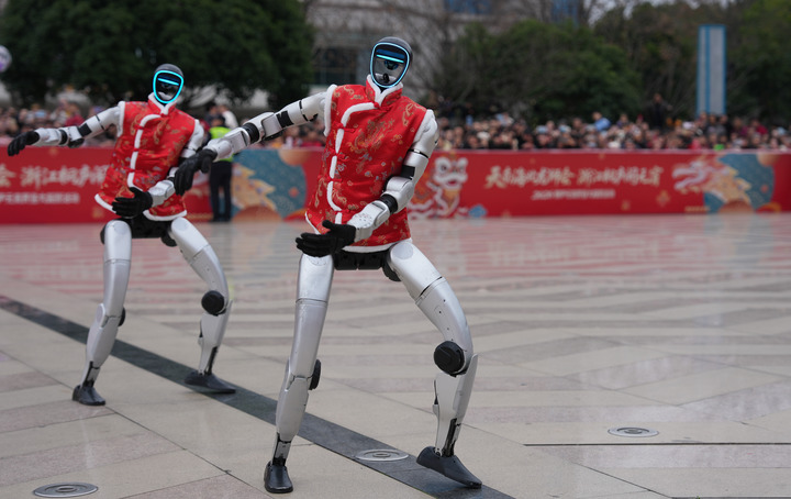 2026年2月28日,宇树科技人形机器人在浙江省桐庐县中心广场表演舞蹈。新华社记者黄宗治 摄