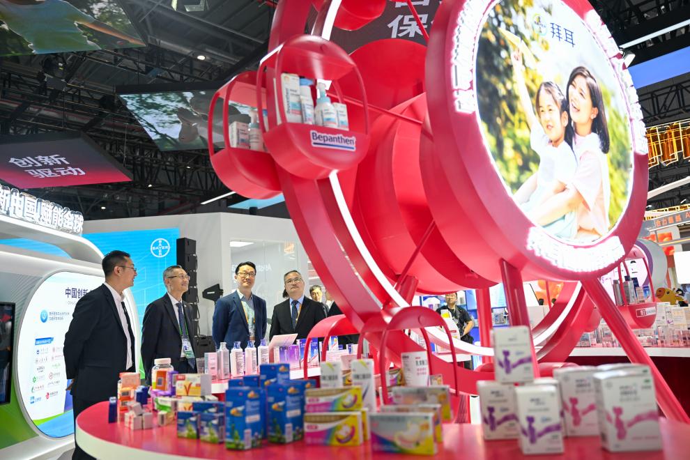 2025年11月7日,观众在进博会医疗器械及医药保健展区拜耳展台参观。新华社记者陈浩明 摄