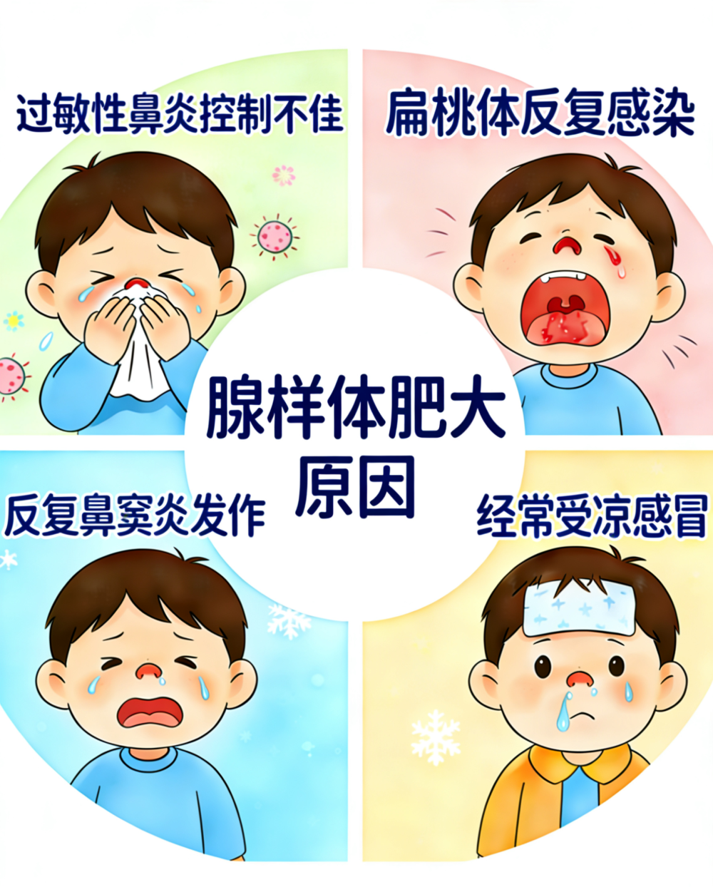 儿童打呼噜多数是腺样体肥大导致,引起腺样体肥大的原因很多,如过敏性鼻炎控制不佳、反复鼻窦炎发作、扁桃体反复感染、经常受凉感冒等。