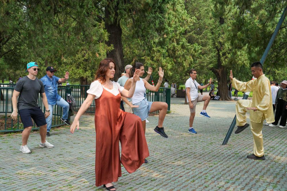 ↑2024年7月9日,几名来自意大利的游客在北京天坛公园体验练习太极拳。