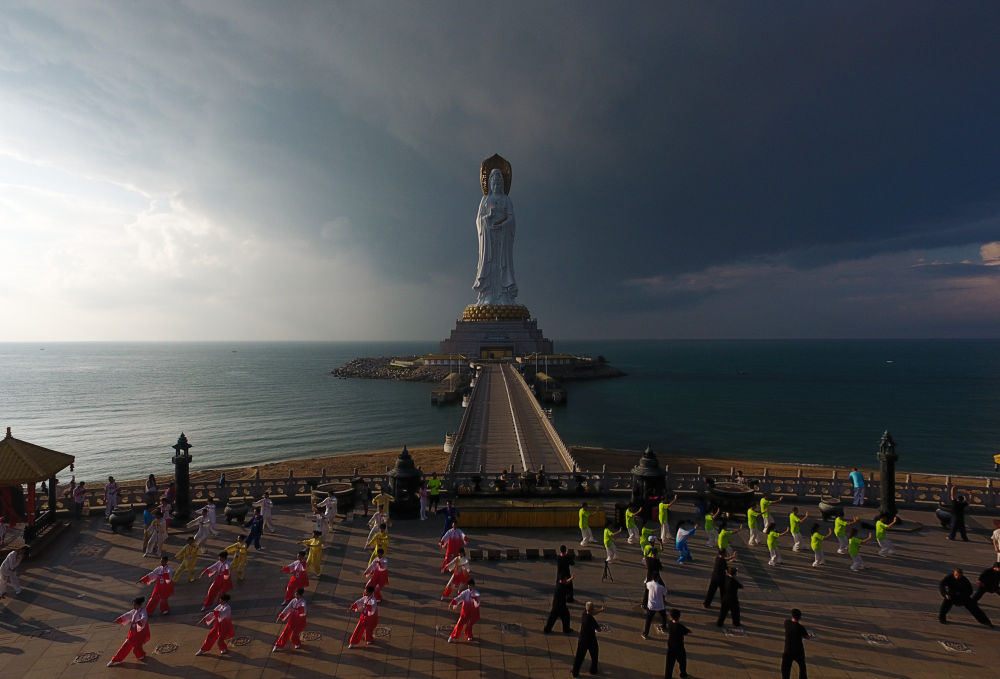 ↑2017年9月23日,太极拳爱好者在海南省三亚市南山海上观音广场打太极拳。
