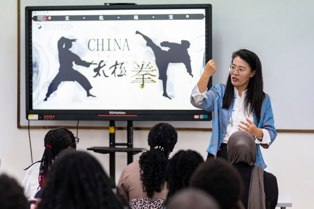 ↑2026年3月18日,在肯尼亚内罗毕大学孔子学院,中方院长王尚雪为当地学生讲授太极拳相关知识。