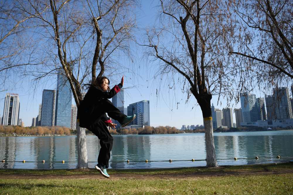 ↑2024年1月23日,安徽医科大学国际教育学院临床医学专业2019级学生、来自法国里昂的章伯涵在安徽省合肥市天鹅湖畔练习太极拳。
