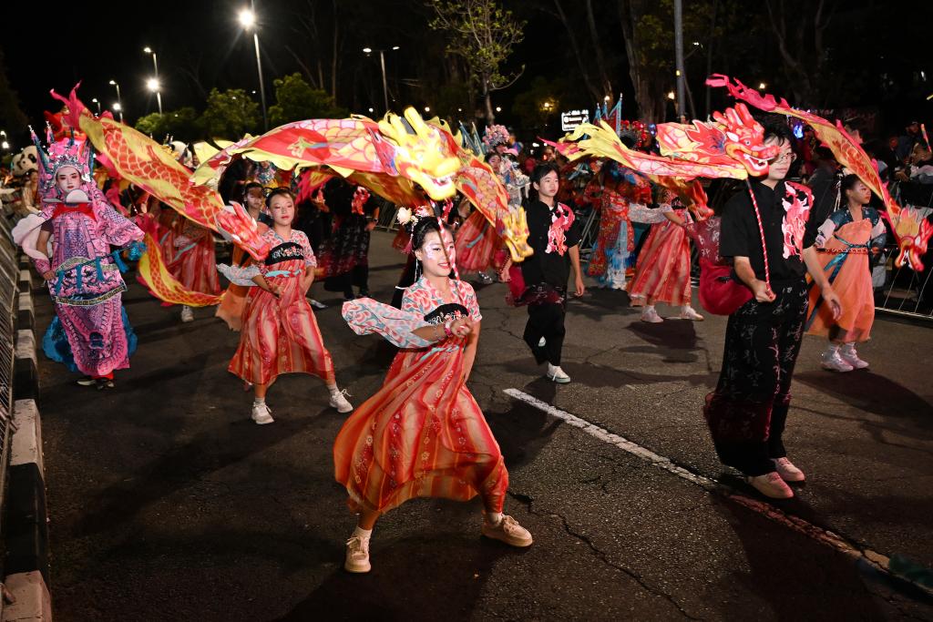 3月21日,在南非开普敦,中国方阵的表演者参加开普敦狂欢节游行。新华社发(哈比索·姆卡贝拉摄)