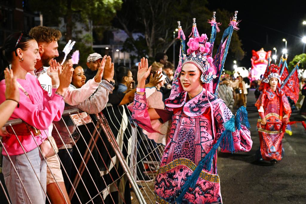 《最炫民族风》的背景音乐中,从黄色长裙到粉色荷花的一秒变装引来阵阵惊叹;两米多高的大熊猫人偶憨态可掬,和道路两旁的观众亲密互动;巨大的红色传统狮形花灯流光溢彩,花车上的人形机器人吸引游客纷纷拍照……在21日晚举行的2026年南非开普敦狂欢节上,中国元素成为整场活动中最为惊艳的一抹色彩。