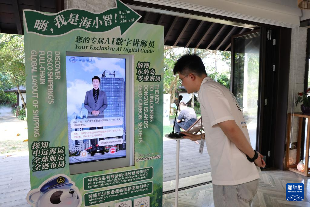 3月25日,工作人员在博鳌亚洲论坛年会会场与AI数字讲解员对话。