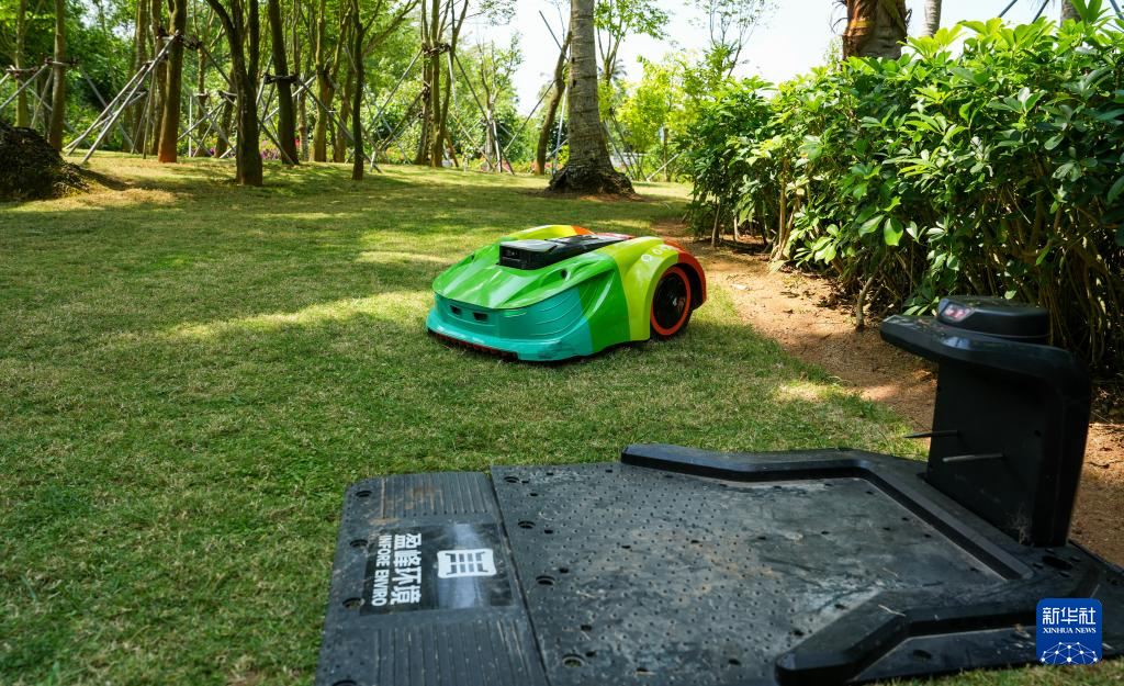 3月25日,智能无人割草机在中国(海南)南海博物馆周边草坪上作业。