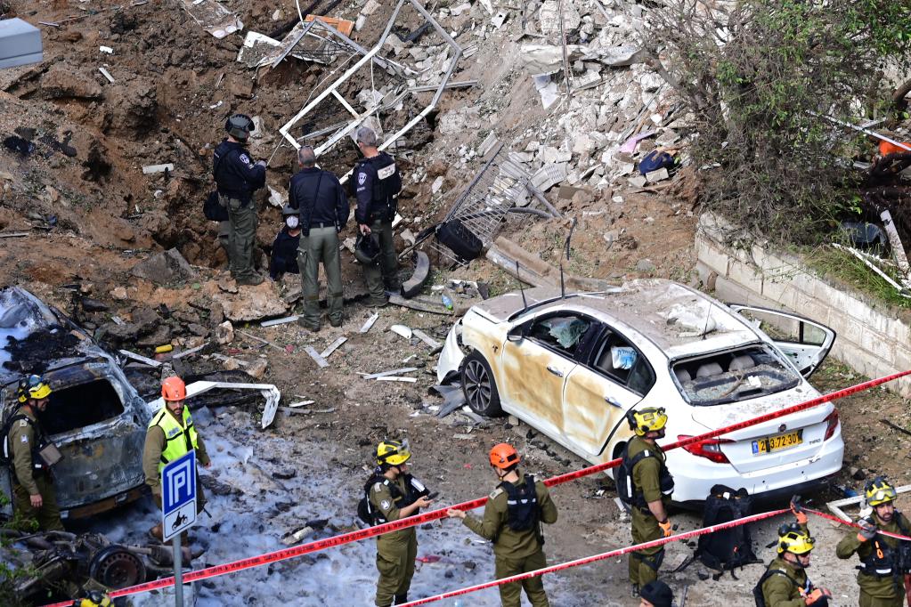 3月24日,在以色列中部城市特拉维夫,应急人员在导弹袭击现场处置。据伊朗伊斯兰共和国广播电视台24日报道,伊朗当天向以色列发动新一轮导弹袭击,“导弹已突破以色列多个导弹防御系统”。新华社发(托默·诺伊贝格摄/基尼图片社)