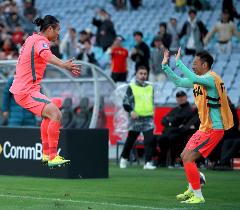 3月27日,中国队球员张玉宁(左)在比赛中进球后庆祝。新华社记者 马平 摄