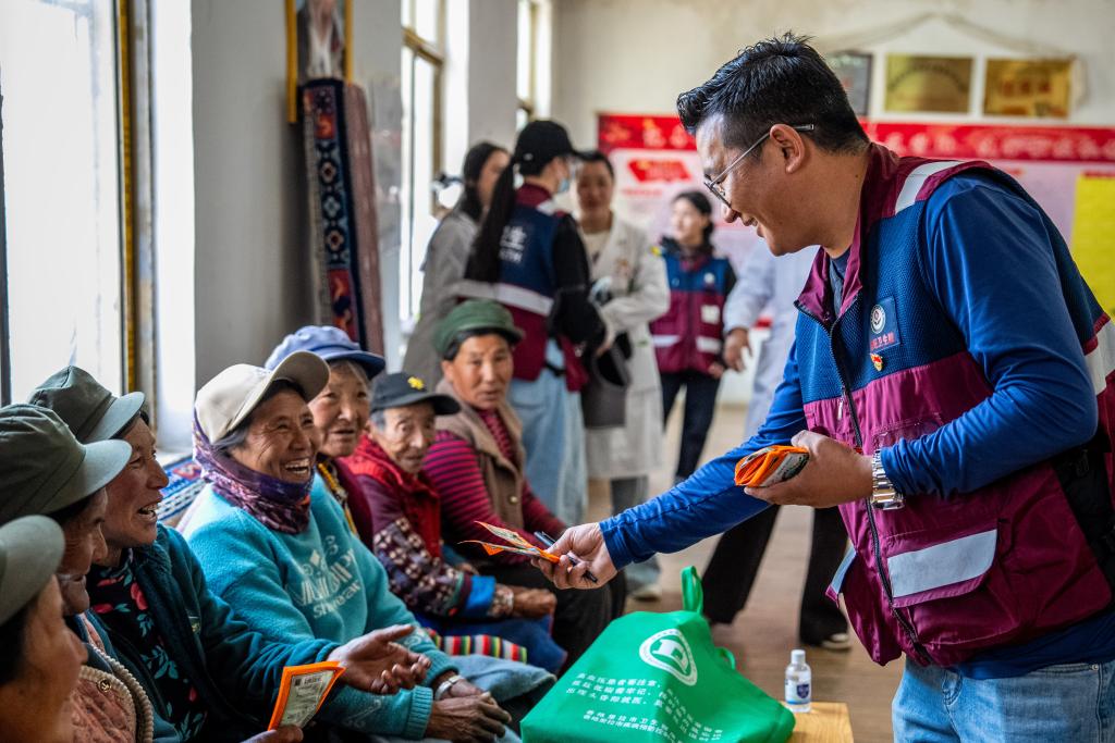 测量血压血氧、操作心电图、听诊心肺、免费发放药品……一时间,巡诊现场暖意融融,村民们拉着医生们的手,久久不肯松开。卫生院院长知诗定基说,村里老人很需要止痛膏和滴眼液。一袋膏药和一瓶滴眼液,送到手里就是送一份安心。