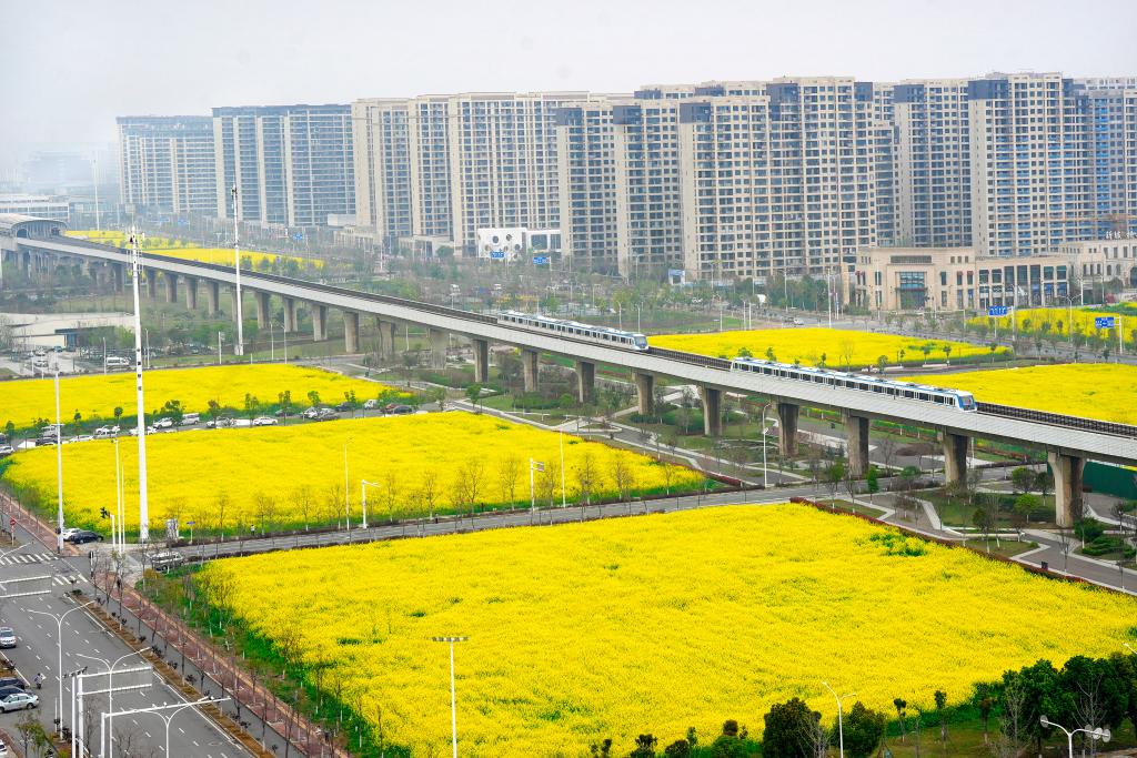 新华社武汉3月29日电(记者龚联康)3月28日,湖北武汉天气晴好。在武汉东西湖区金北一路的油菜花田边,市民李聂云身着浅粉色汉服,在盛放的油菜花丛中举起相机,拍下自己与飞驰的地铁列车同框的照片。“一出地铁站便是满目金黄,仿佛置身画境。”李聂云说。