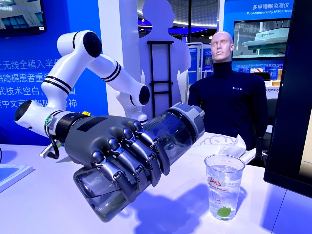 3月27日在2026中关村论坛年会展览上拍摄的“北脑一号”智能脑机系统启动机械臂往杯里倒水。新华社记者 魏梦佳 摄