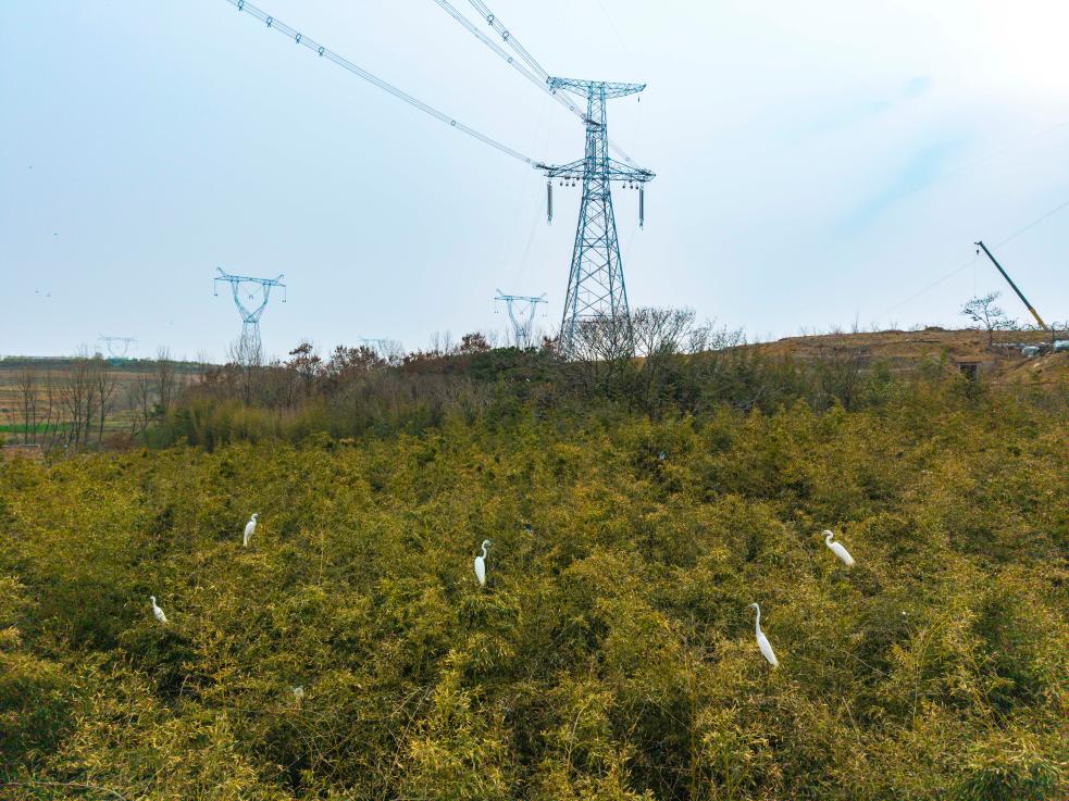 白鹭在烟威1000千伏特高压线路工程日照段沿线栖息,鸟类与架线施工和谐共融。新华社发