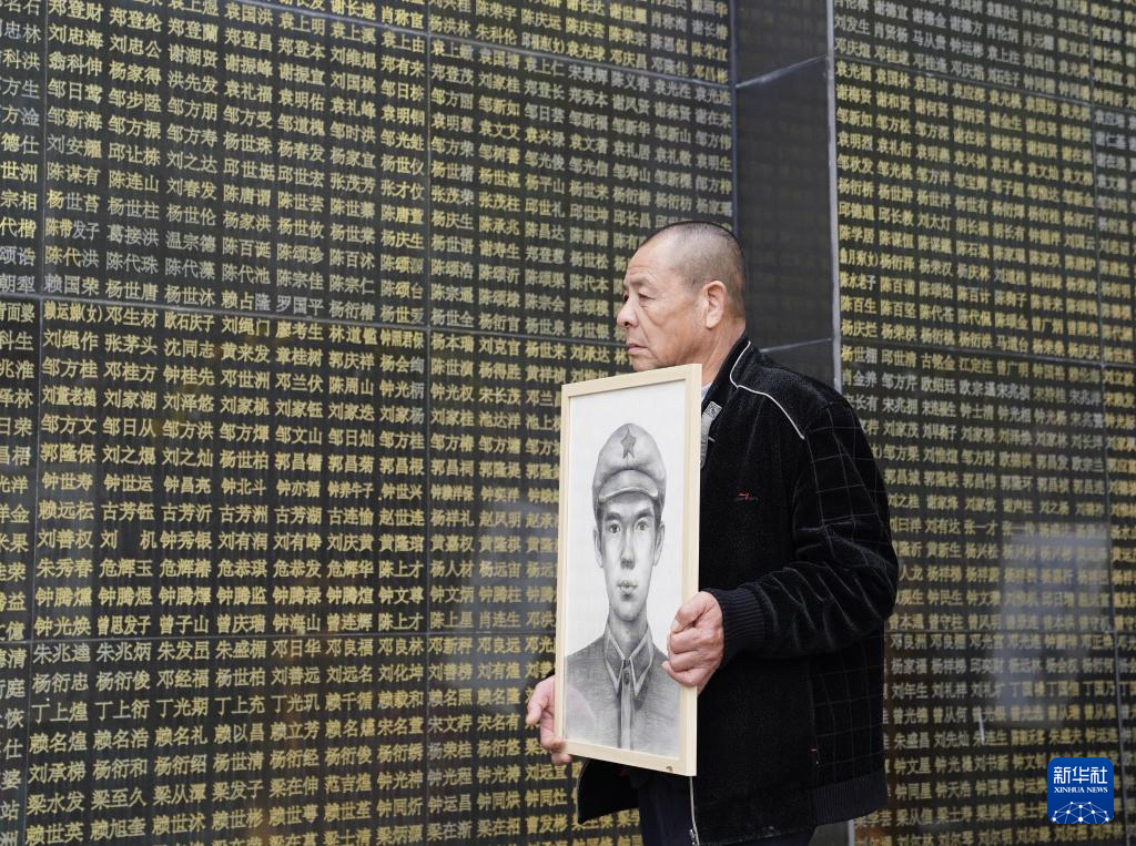 在瑞金革命烈士陵园,烈士家属手捧画像从烈士名单前走过(4月1日摄)。